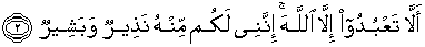2. agar kamu tidak menyembah selain Allah. Sesungguhnya aku (Muhammad) adalah pemberi peringatan dan pembawa khabar gembira kepadamu daripada-Nya,