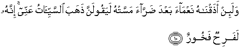 10. Dan jika Kami rasakan kepadanya kebahagiaan sesudah bencana yang menimpanya, niscaya dia akan berkata: "Telah hilang bencana-bencana itu daripadaku"; sesungguhnya dia sangat gembira lagi bangga,