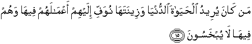 15. Barangsiapa yang menghendaki kehidupan dunia dan perhiasannya, niscaya Kami berikan kepada mereka balasan pekerjaan mereka di dunia dengan sempurna dan mereka di dunia itu tidak akan dirugikan.
