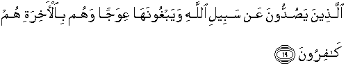 19. (yaitu) orang-orang yang menghalangi (manusia) dari jalan Allah dan menghendaki (supaya) jalan itu bengkok. Dan mereka itulah orang-orang yang tidak percaya akan adanya hari akhirat.