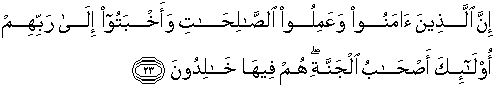 23. Sesungguhnya orang-orang yang beriman dan mengerjakan amal-amal saleh dan merendahkan diri kepada Tuhan mereka, mereka itu adalah penghuni-penghuni syurga; mereka kekal di dalamnya.