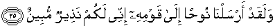 25. Dan sesungguhnya Kami telah mengutus Nuh kepada kaumnya, (dia berkata): "Sesungguhnya aku adalah pemberi peringatan yang nyata bagi kamu,