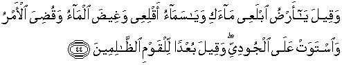 44. Dan difirmankan: "Hai bumi telanlah airmu, dan hai langit (hujan)