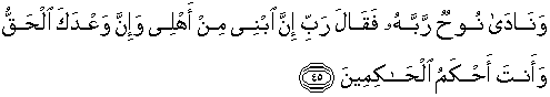45. Dan Nuh berseru kepada Tuhannya sambil berkata: "Ya Tuhanku, sesungguhnya anakku termasuk keluargaku, dan sesungguhnya janji Engkau itulah yang benar. Dan Engkau adalah Hakim yang seadil-adilnya."