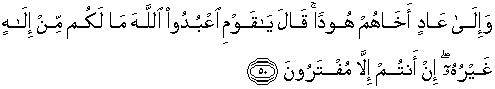 50. Dan kepada kaum 'Ad (Kami utus) saudara mereka, Huud. Ia berkata: "Hai kaumku, sembahlah Allah, sekali-kali tidak ada bagimu Tuhan selain Dia. Kamu hanyalah mengada-adakan saja.