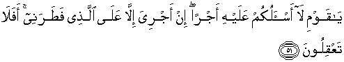 51. Hai kaumku, aku tidak meminta upah kepadamu bagi seruanku ini. Upahku tidak lain hanyalah dari Allah yang telah menciptakanku. Maka tidakkah kamu memikirkan(nya)?"