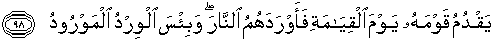 98. Ia berjalan di muka kaumnya di hari kiamat lalu memasukkan mereka ke dalam neraka. Neraka itu seburuk-buruk tempat yang didatangi.