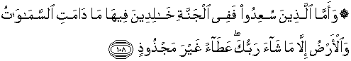 108. Adapun orang-orang yang berbahagia, maka tempatnya di dalam syurga, mereka kekal di dalamnya selama ada langit dan bumi, kecuali jika Tuhanmu menghendaki (yang lain); sebagai karunia yang tiada putus-putusnya.