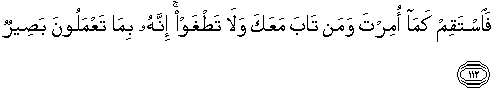 112. Maka tetaplah kamu pada jalan yang benar, sebagaimana diperintahkan kepadamu dan (juga) orang yang telah taubat beserta kamu dan janganlah kamu melampaui batas. Sesungguhnya Dia Maha Melihat apa yang kamu kerjakan.