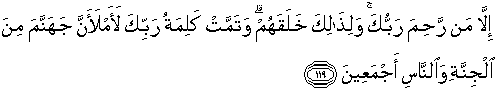 119. kecuali orang-orang yang diberi rahmat oleh Tuhanmu. Dan untuk itulah Allah menciptakan mereka. Kalimat Tuhanmu (keputusan-Nya) telah ditetapkan: sesungguhnya Aku akan memenuhi neraka Jahannam dengan jin dan manusia (yang durhaka) semuanya.