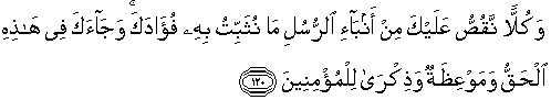 120. Dan semua kisah dari rasul-rasul Kami ceritakan kepadamu, ialah kisah-kisah yang dengannya Kami teguhkan hatimu; dan dalam surat ini telah datang kepadamu kebenaran serta pengajaran dan peringatan bagi orang-orang yang beriman.
