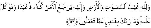 123. Dan kepunyaan Allah-lah apa yang ghaib di langit dan di bumi dan kepada-Nya-lah dikembalikan urusan-urusan semuanya, maka sembahlah Dia, dan bertawakkallah kepada-Nya. Dan sekali-kali Tuhanmu tidak lalai dari apa yang kamu kerjakan.