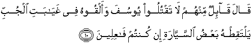 10. Seorang diantara mereka berkata: "Janganlah kamu bunuh Yusuf, tetapi masukkanlah dia ke dasar sumur supaya dia dipungut oleh beberapa orang musafir, jika kamu hendak berbuat."