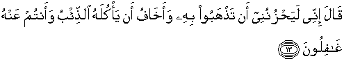 13. Berkata Ya'qub: "Sesungguhnya kepergian kamu bersama Yusuf amat menyedihkanku dan aku khawatir kalau-kalau dia dimakan serigala, sedang kamu lengah dari padanya."