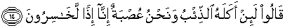 14. Mereka berkata: "Jika ia benar-benar dimakan serigala, sedang kami golongan (yang kuat), sesungguhnya kami kalau demikian adalah orang-orang yang merugi