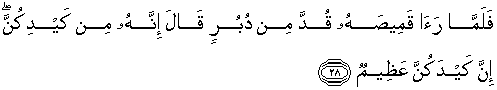 28. Maka tatkala suami wanita itu melihat baju gamis Yusuf koyak di belakang berkatalah dia: "Sesungguhnya (kejadian) itu adalah diantara tipu daya kamu, sesungguhnya tipu daya kamu adalah besar."