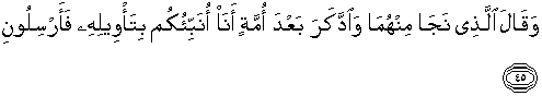 45. Dan berkatalah orang yang selamat diantara mereka berdua dan teringat (kepada Yusuf) sesudah beberapa waktu lamanya: "Aku akan memberitakan kepadamu tentang (orang yang pandai) mena'birkan mimpi itu, maka utuslah aku (kepadanya)."