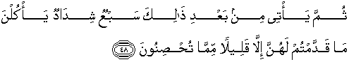 48. Kemudian sesudah itu akan datang tujuh tahun yang amat sulit, yang menghabiskan apa yang kamu simpan untuk menghadapinya (tahun sulit), kecuali sedikit dari (bibit gandum) yang kamu simpan.