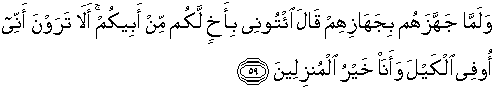 59. Dan tatkala Yusuf menyiapkan untuk mereka bahan makanannya, ia berkata: "Bawalah kepadaku saudaramu yang seayah dengan kamu (Bunyamin), tidakkah kamu melihat bahwa aku menyempurnakan sukatan dan aku adalah sebaik-baik penerima tamu?