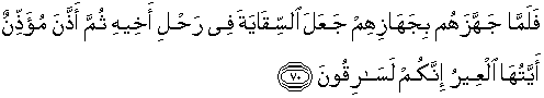 70. Maka tatkala telah disiapkan untuk mereka bahan makanan mereka, Yusuf memasukkan piala (tempat minum) ke dalam karung saudaranya. Kemudian berteriaklah seseorang yang menyerukan: "Hai kafilah, sesungguhnya kamu adalah orang-orang yang mencuri."