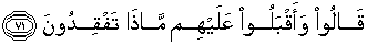 71. Mereka menjawab, sambil menghadap kepada penyeru-penyeru itu: "Barang apakah yang hilang dari pada kamu?"