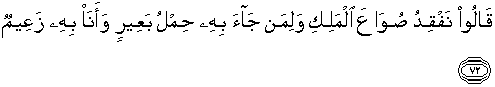 72. Penyeru-penyeru itu berkata: "Kami kehilangan piala raja, dan siapa yang dapat mengembalikannya akan memperoleh bahan makanan (seberat) beban unta, dan aku menjamin terhadapnya."