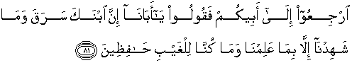 81. Kembalilah kepada ayahmu dan katakanlah: "Wahai ayah kami! Sesungguhnya anakmu telah mencuri, dan kami hanya menyaksikan apa yang kami ketahui, dan sekali-kali kami tidak dapat menjaga (mengetahui) barang yang ghaib.