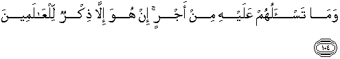 104. Dan kamu sekali-kali tidak meminta upah kepada mereka (terhadap seruanmu ini), itu tidak lain hanyalah pengajaran bagi semesta alam.