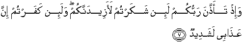 7. Dan (ingatlah juga), tatkala Tuhanmu memaklumkan; "Sesungguhnya jika kamu bersyukur, pasti Kami akan menambah (nikmat) kepadamu, dan jika kamu mengingkari (nikmat-Ku), maka sesungguhnya azab-Ku sangat pedih."