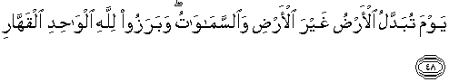 48. (Yaitu) pada hari (ketika) bumi diganti dengan bumi yang lain dan (demikian pula) langit, dan meraka semuanya (di padang Mahsyar) berkumpul menghadap ke hadirat Allah yang Maha Esa lagi Maha Perkasa.