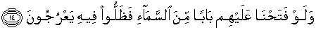 14. Dan jika seandainya Kami membukakan kepada mereka salah satu dari (pintu-pintu) langit, lalu mereka terus menerus naik ke atasnya,