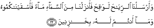 22. Dan Kami telah meniupkan angin untuk mengawinkan (tumbuh-tumbuhan) dan Kami turunkan hujan dari langit, lalu Kami beri minum kamu dengan air itu, dan sekali-kali bukanlah kamu yang menyimpannya.