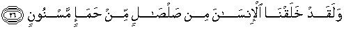26. Dan sesungguhnya Kami telah menciptakan manusia (Adam) dari tanah liat kering (yang berasal) dari lumpur hitam yang diberi bentuk.