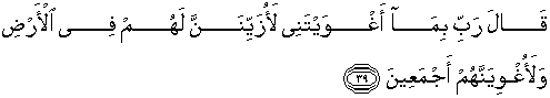 39. Iblis berkata: "Ya Tuhanku, oleh sebab Engkau telah memutuskan bahwa aku sesat, pasti aku akan menjadikan mereka memandang baik (perbuatan ma'siat) di muka bumi, dan pasti aku akan menyesatkan mereka semuanya,