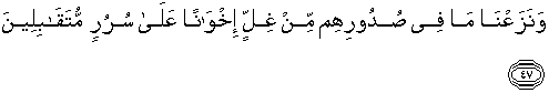 47. Dan Kami lenyapkan segala rasa dendam yang berada dalam hati mereka, sedang mereka merasa bersaudara duduk berhadap-hadapan di atas dipan-dipan.