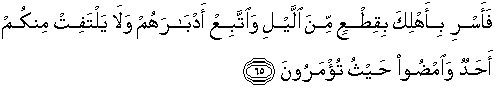 65. Maka pergilah kamu di akhir malam dengan membawa keluargamu, dan ikutlah mereka dari belakang dan janganlah seorangpun di antara kamu menoleh kebelakang