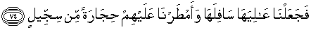 74. Maka Kami jadikan bahagian atas kota itu terbalik ke bawah dan Kami hujani mereka dengan batu dari tanah yang keras.