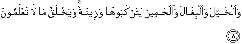 dan keledai, agar kamu menungganginya dan (menjadikannya) perhiasan. Dan Allah menciptakan apa yang kamu tidak mengetahuinya.