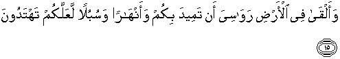 15. Dan Dia menancapkan gunung-gunung di bumi supaya bumi itu tidak goncang bersama kamu, (dan Dia menciptakan) sungai-sungai dan jalan-jalan agar kamu mendapat petunjuk,