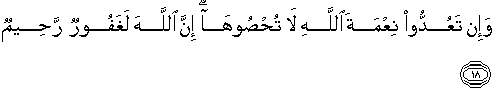 18. Dan jika kamu menghitung-hitung nikmat Allah, niscaya kamu tak dapat menentukan jumlahnya. Sesungguhnya Allah benar-benar Maha Pengampun lagi Maha Penyayang.