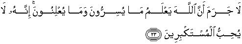 23. Tidak diragukan lagi bahwa sesungguhnya Allah mengetahui apa yang mereka rahasiakan dan apa yang mereka lahirkan. Sesungguhnya Allah tidak menyukai orang-orang yang sombong.