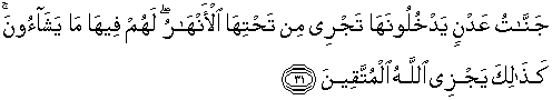 31. (yaitu) syurga 'Adn yang mereka masuk ke dalamnya, mengalir di bawahnya sungai-sungai, di dalam surga itu mereka mendapat segala apa yang mereka kehendaki. Demikianlah Allah memberi balasan kepada orang-orang yang bertakwa,