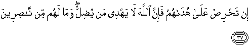37. Jika kamu sangat mengharapkan agar mereka dapat petunjuk, maka sesungguhnya Allah tiada memberi petunjuk kepada orang yang disesatkan-Nya, dan sekali-kali mereka tiada mempunyai penolong.