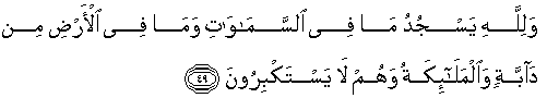 49. Dan kepada Allah sajalah bersujud segala apa yang berada di langit dan semua makhluk yang melata di bumi dan (juga) para ma]aikat, sedang mereka (malaikat) tidak menyombongkan diri.