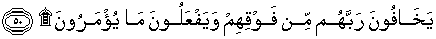 50. Mereka takut kepada Tuhan mereka yang di atas mereka dan melaksanakan apa yang diperintahkan (kepada mereka).