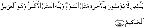 60. Orang-orang yang tidak beriman kepada kehidupan akhirat, mempunyai sifat yang buruk; dan Allah mempunyai sifat yang Maha Tinggi; dan Dia-lah Yang Maha Perkasa lagi Maha Bijaksana.