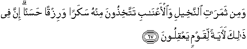 67. Dan dari buah korma dan anggur, kamu buat minimuman yang memabukkan dan rezki yang baik. Sesunggguhnya pada yang demikian itu benar-benar terdapat tanda (kebesaran Allah) bagi orang yang memikirkan.