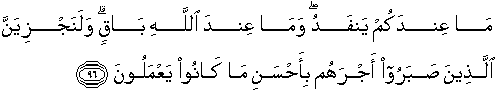 96. Apa yang di sisimu akan lenyap, dan apa yang ada di sisi Allah adalah kekal. Dan sesungguhnya Kami akan memberi balasan kepada orang-orang yang sabar dengan pahala yang lebih baik dari apa yang telah mereka kerjakan.