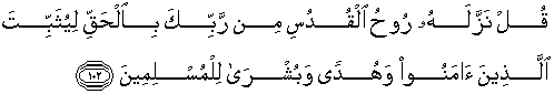 102. Katakanlah: "Ruhul Qudus (Jibril) menurunkan Al Quran itu dari Tuhanmu dengan benar, untuk meneguhkan (hati) orang-orang yang telah beriman, dan menjadi petunjuk serta kabar gembira bagi orang-orang yang berserah diri (kepada Allah)."
