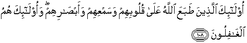 108. Mereka itulah orang-orang yang hati, pendengaran dan penglihatannya telah dikunci mati oleh Allah, dan mereka itulah orang-orang yang lalai.